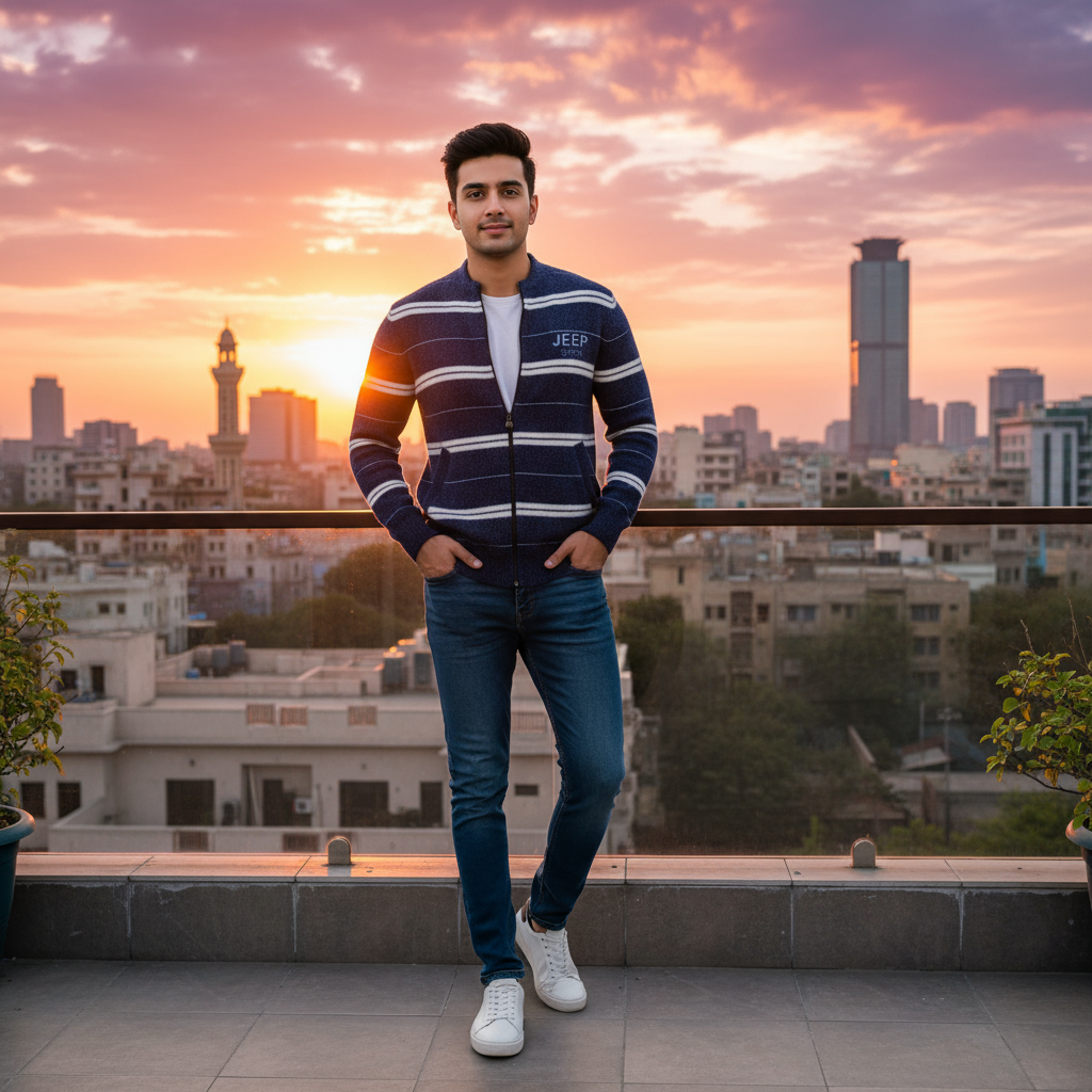 Stay warm and effortlessly stylish with this Men’s Navy & White Striped Full-Zip Knitted Sweater. Designed with a modern, slim-fit silhouette, this sweater combines comfort, versatility, and contemporary streetwear appeal. The rich navy base is accented with clean horizontal white stripes for a timeless, athletic-inspired look.